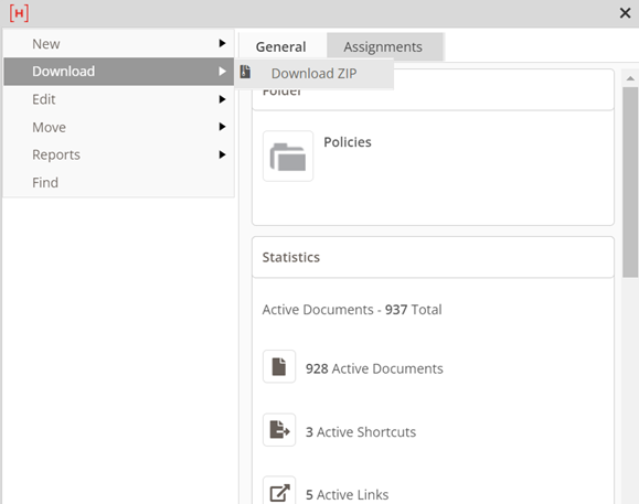 - Open the root level folder menu (the three-bar menu to the left of the topmost folder – will be the document set name), select Download, then Download ZIP