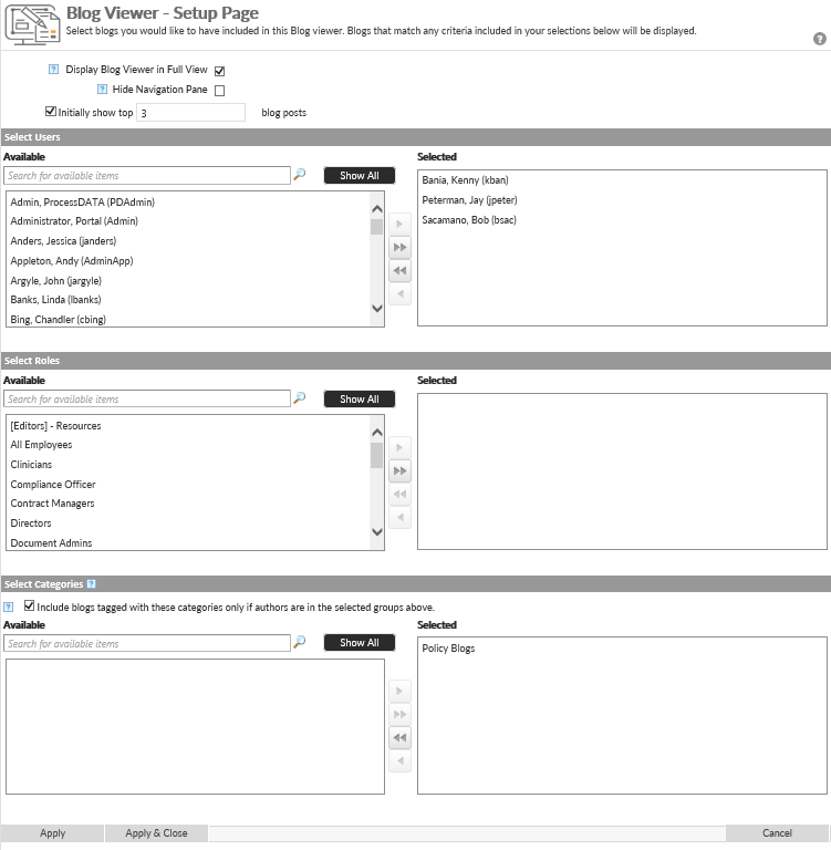 To add peoples’ blogs to the viewer, select the users from the Available column and click the