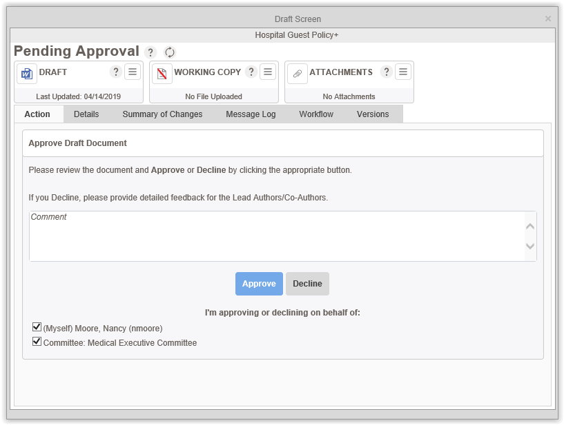 It should be noted that a user that is assigned to a committee can also be assigned as an approver separately from the committee. If this is the case, the Draft Screen will contain checkboxes so the user can then chose whether they want to approve as themselves, on behalf of their committee, or both.