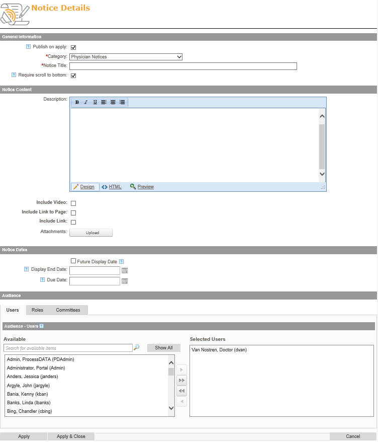 - Under the Audience section, select either individual users, roles, or committees to receive the notice.