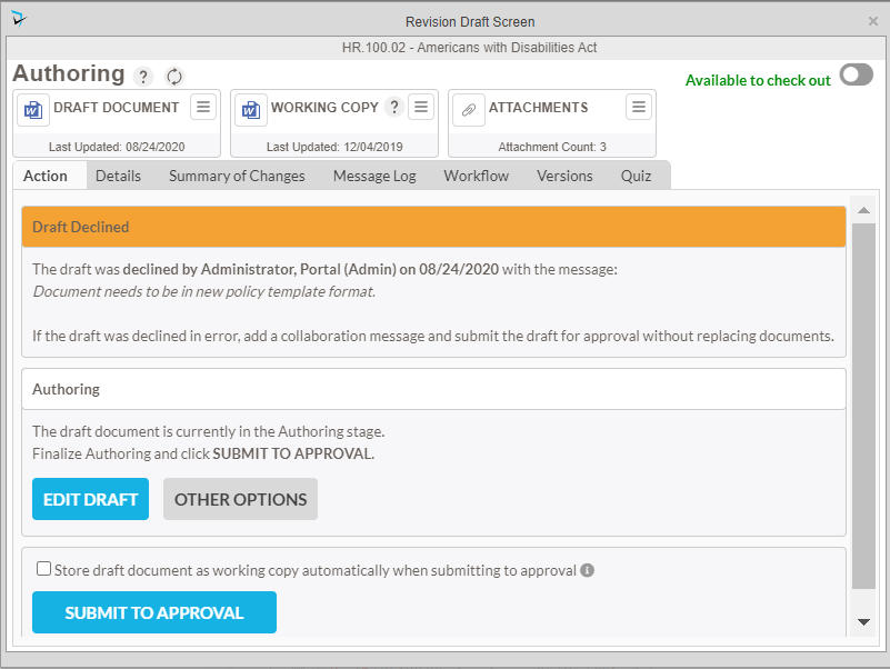 On the Action tab, the Lead Authors have a couple of options to author a policy. The Author may edit the existing version of the document by selecting Edit Draft. If the Lead Author would like to select a different document as the draft, they will click Other Options. Here, the Lead Author may:
