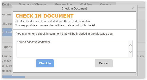To check in a policy you can either go to the Draft menu or click on the toggle to check the policy back in. Once you choose the option to check the policy back in, a popup will be displayed that will give you the option to leave a message in the message log tab of the Draft Screen.