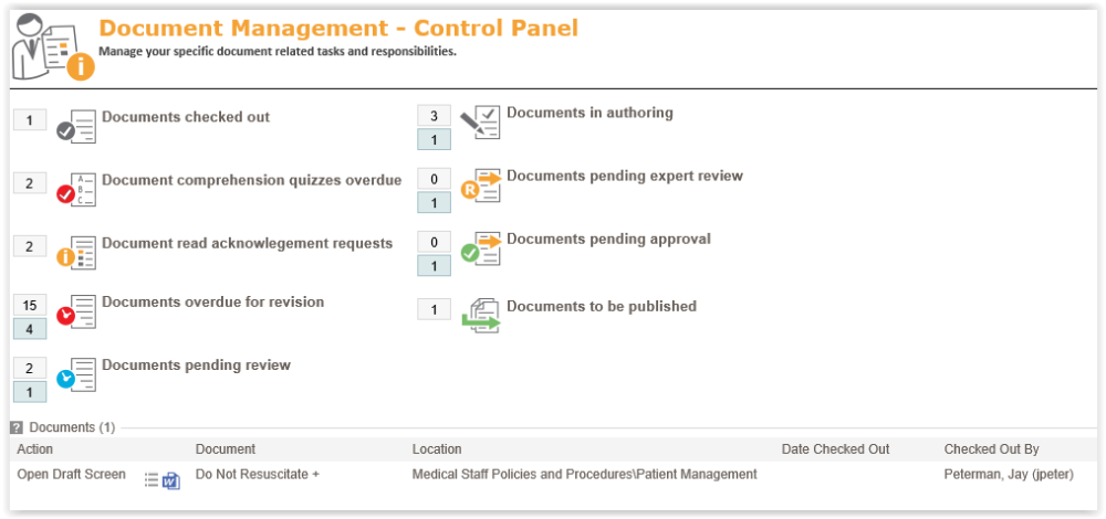 - Control Panel – This is a component or an item in the toolbar of the Policies component that lists the different steps in the workflow that you are responsible for. Clicking on these will reveal what documents are in that step of the workflow that you are responsible for. Click on the link to the left of the document title that is labeled for the step in the workflow it is in.