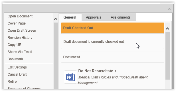 When a policy is checked out, the Info Card will display an alert indicating that the draft is currently checked so other workflow participants know before opening the draft screen.