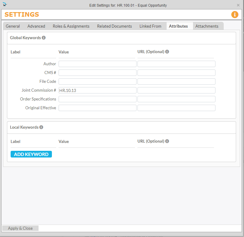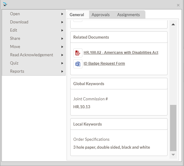 The P&P module allows for defining keywords that can be specified for folders and documents. Keywords are additional descriptors that moderators and authors may want to attach to their documents to simplify searches or provide additional information about the document. For example, a keyword could be set up to store the policy number, a Joint Commission standard, or the original effective date for a document.