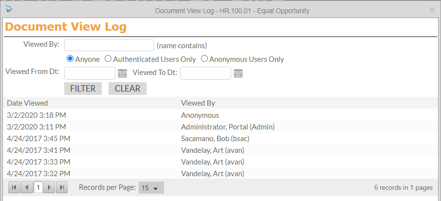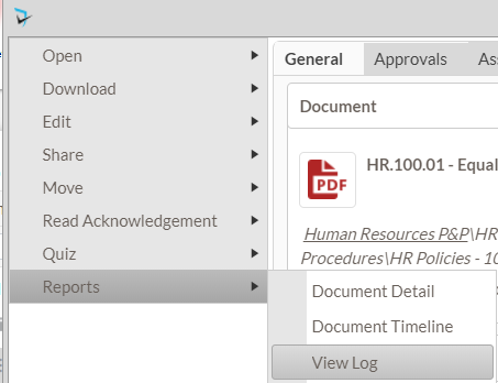 To see who has viewed a particular policy and when they viewed, moderators and administrators can access the policy’s View Log. To access the View Log for a policy, users will open he Document menu (