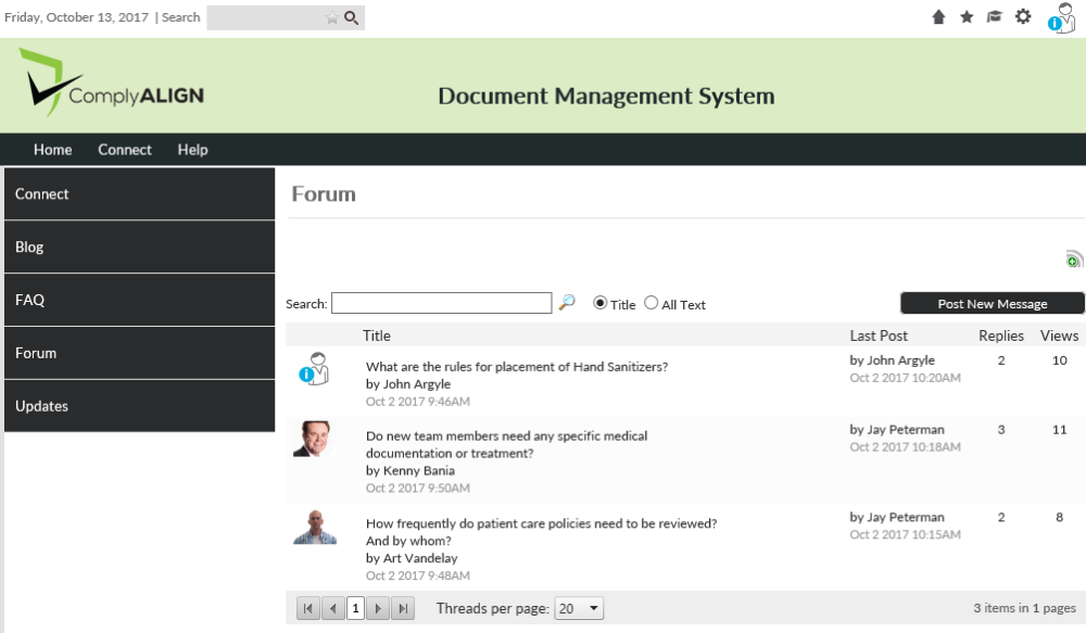 The Forum page gives users the ability to post and view messages. All messages are organized into threads. Users that have the permissions of posting messages can start their own new threads and reply to previously posted messages. Optionally, you can configure a moderator for the Forum to approve messages before they are published to the end user. Any single forum can be searched for a specified keyword and search results will provide a link directly to the message where the searched word was found.