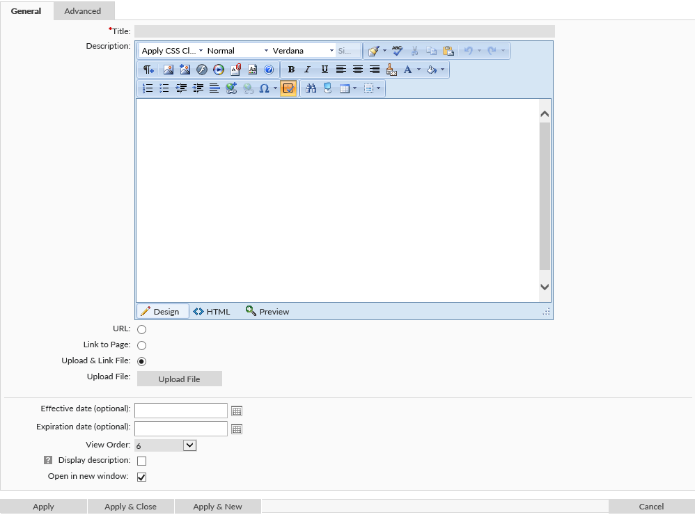 - Open in new window – This will open links in a new window. Select this if linking to a external website or file. Uncheck this if linking to another page within the system.