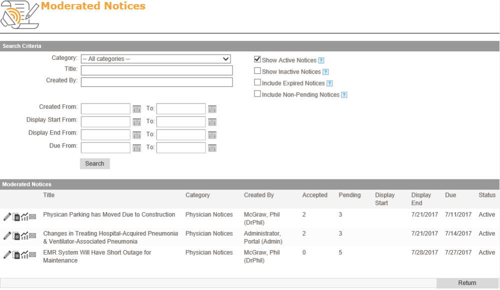 Below the search criteria you will see a list of Moderated Notices. In this list, each notice will have a series of icons