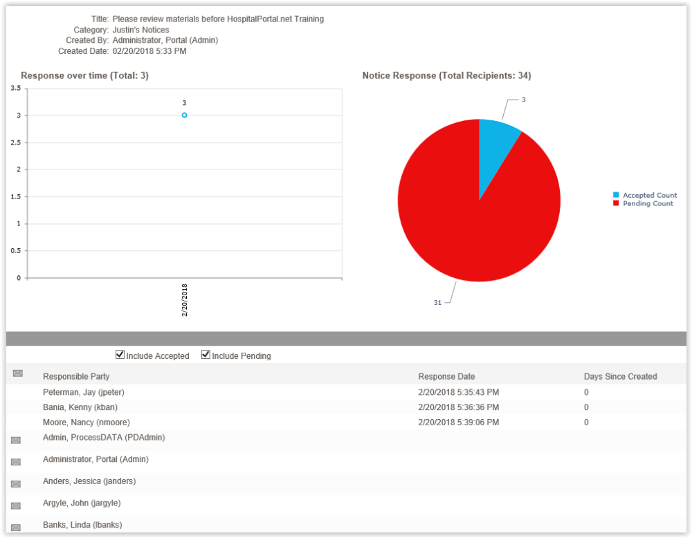 – This will display a new page with a couple of charts that indicate who has and has yet to accept the given notice. It will also provide a list of users that the notice was for that shows the responsible party, Response Date, and Days Since Created. Next to each name is an Email icon (