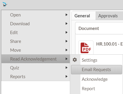 Moderators may send email notifications to all Policy Readers for a given document to notify them of the read acknowledgement. The email notification contains the name of the document to be read, the path to the document, and a hyperlink back to the Read Acknowledgement Screen. To manually send Read Acknowledgement email notifications: