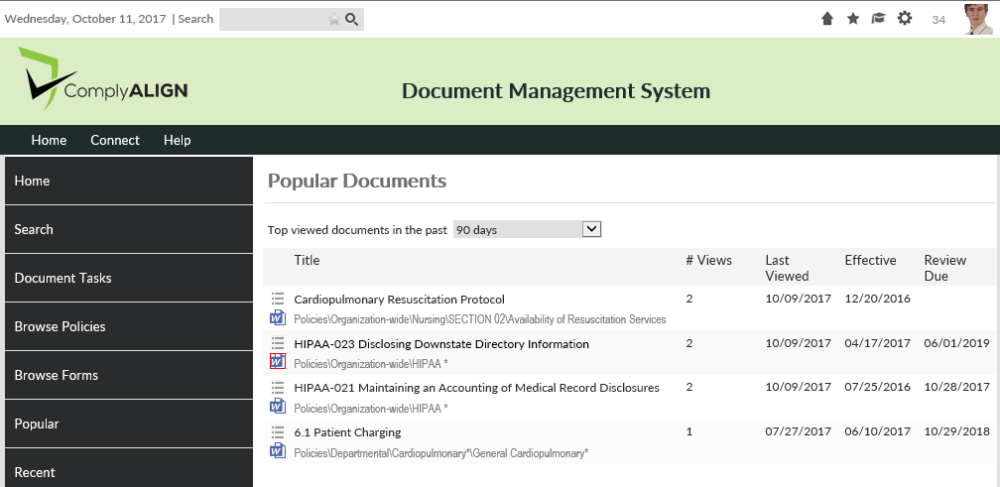 This page simply displays a grid with the top most viewed documents in the system. Users can select to view the top viewed document in the past 24 hours, 7 days, 30 days, 60 days, or 90 days.