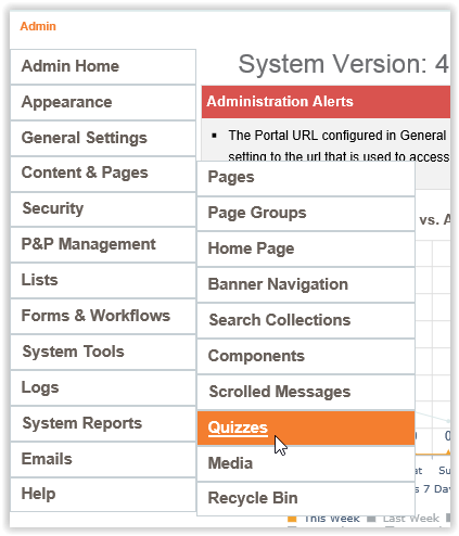 - In the left menu users will select Content & Pages, then Quizzes.