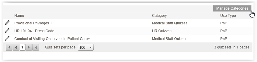 Before building any Quizzes, Administrators must create Quiz Categories. Quiz Categories enable users to define permissions such as the ability to design a quiz, take the quiz, and view the results of the quiz. Having multiple categories is necessary so that each department can assign different users to each permission for their quizzes.
