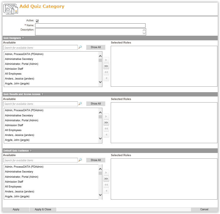 - Default Quiz Audience – Selected users that will be required to take quizzes published for this category by default. Note, this setting can be overwritten when publishing individual quizzes.