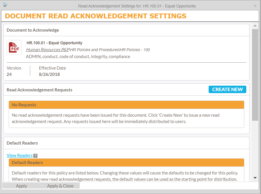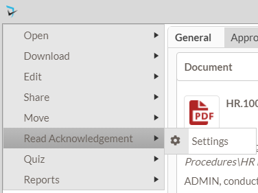 In order to send read acknowledgement request to users, Moderators must configure the acknowledgement on the document. Only Moderators or Administrators have access to configure read acknowledgements. The following steps takes you through setting up a policy read acknowledgement.