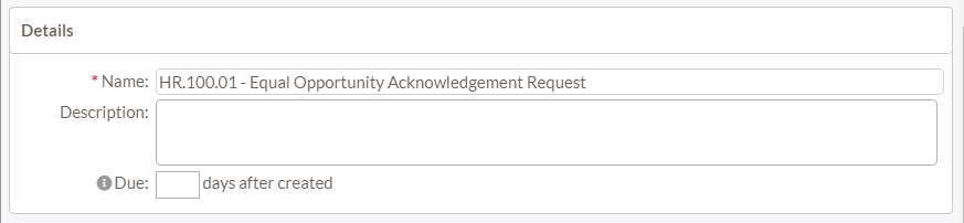 - Due – The acknowledgement request will be due to be completed within the number of days specified after being assigned.