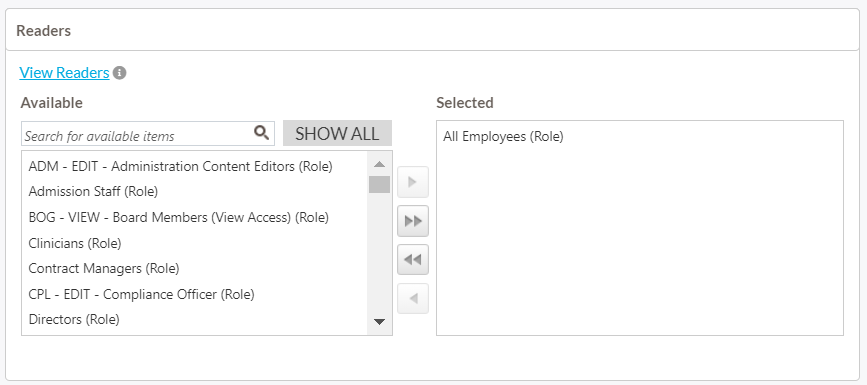 - Reader Options – Moderators can choose whether the readers list will be fixed or grow/shrink with role membership changes. If the moderator chooses Fixed then the list of individual users will stay the same as the day the read acknowledgment was created. If the moderator chooses Readers will grow with role membership then when someone is added to one of the selected security roles, then the readers list will change to reflect that addition.