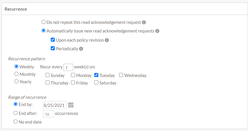 - Automatically issue new read acknowledgement requests – Indicates this is a recurring request. Future requests will be automatically issued based on the configuration in the options below: