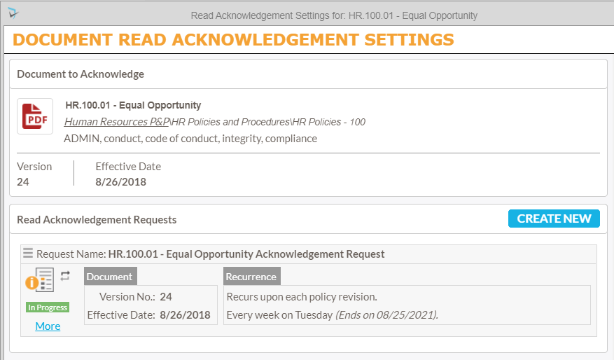 - The Document Read Acknowledgement Settings popup will be displayed. Click on the Create New button to add a new request.
