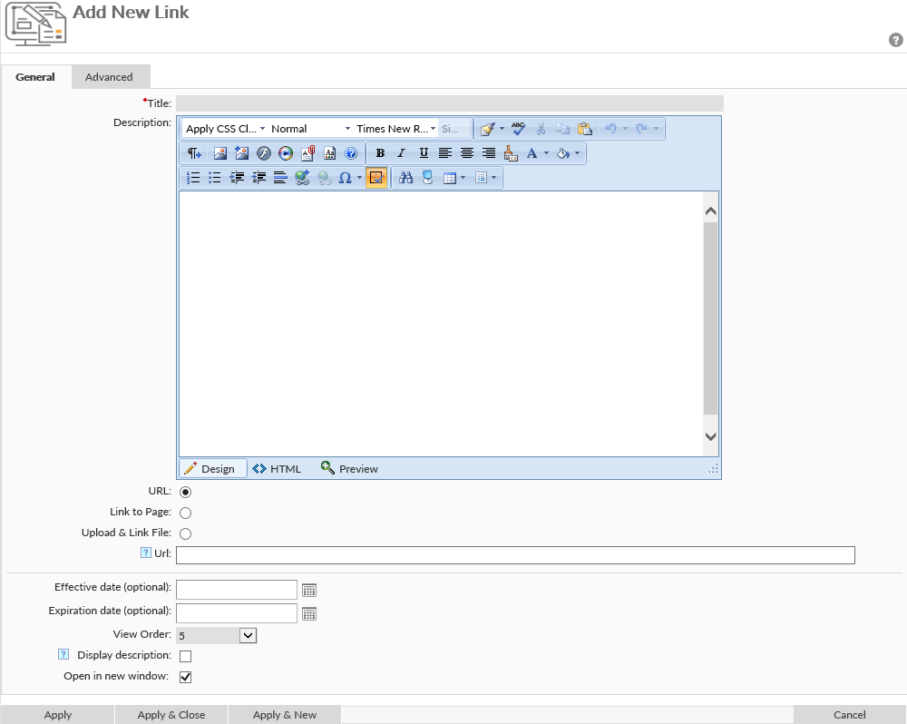Once added to the group, editors create a new link by clicking on the New button () for the section to which you want to add the link. Clicking this icon will bring you to the Add New Link page. On this page: