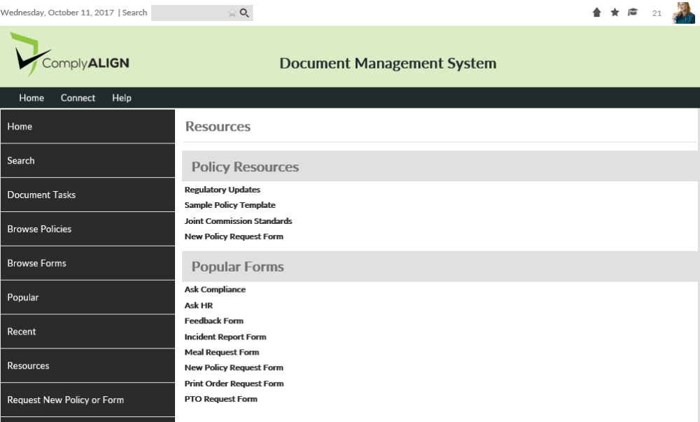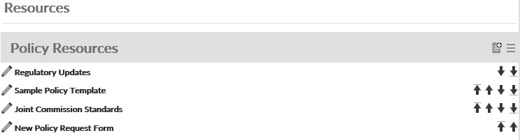 The Resources page allows your organization to display links to websites or documents that can help support your policies, forms, and other documents in your system. Links on this page are split up into three sections: Policy Resources, Popular Forms, Templates.