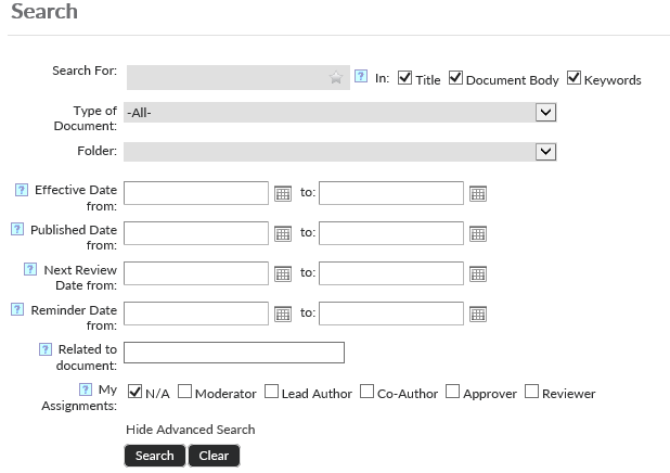 Click on the Advanced Search link next to the “Search” and “Clear” buttons to reveal more search filters. This will give you the ability to return results with an effective date, published date, next review date, and reminder date range. Other filters such as the ability to choose to display search results of documents that you are assigned to.
