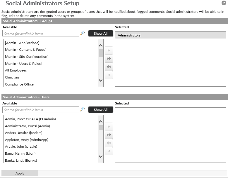 You will see two list selectors. One to select roles, and the other to select individual users. To select users/roles, highlight the users/roles you want to add as Social Administrators from the Available list and uses the (