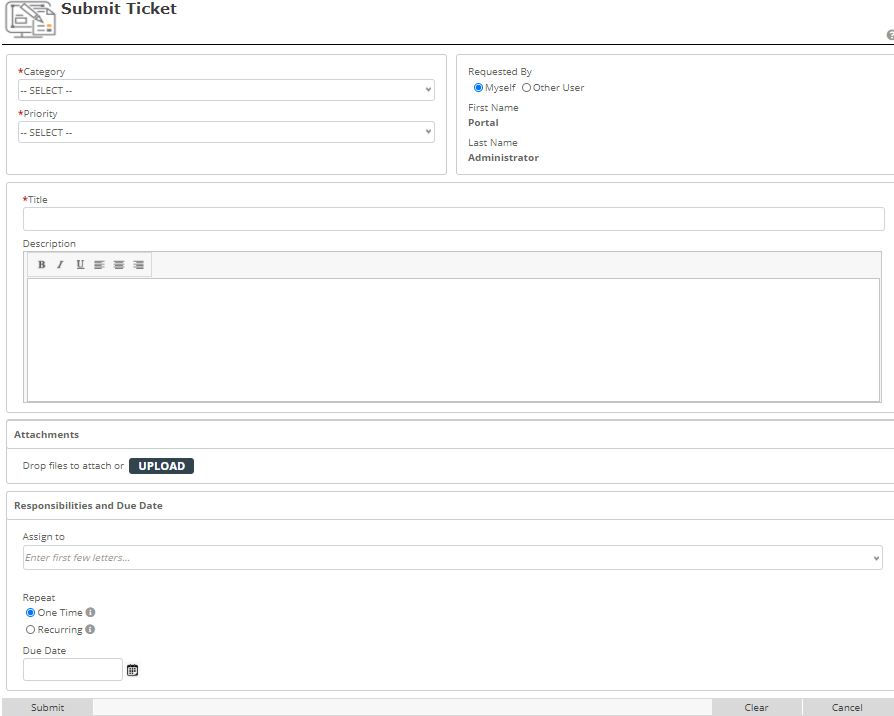 The following screen is used to submit a ticket. User’s name, category, priority, and short description are required to submit a ticket. Submitters may upload files (i.e. screen shots, pictures, files, etc.) to help explain issue at hand by clicking Upload or dragging and dropping the file on the ticket. To submit this ticket, click Submit. To clear the submission form, click Clear. To cancel the submission, click Cancel.