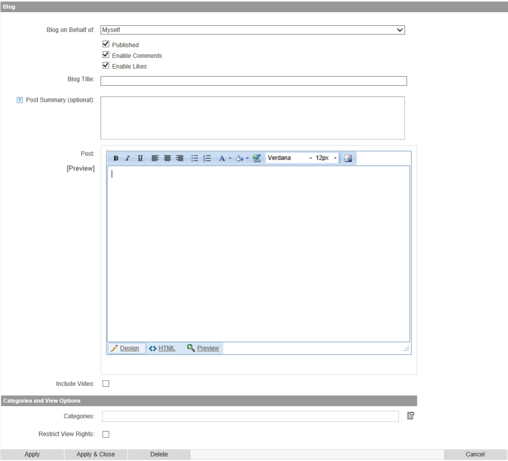 Click on [Add New Blog]. The user will be taken to the edit screen. They can choose to publish the blog right away by checking the check box next to Publish. The user can also leave the check box unchecked if they want to wait to publish to the Blogs page. They can also choose to allow other users to comment and/or like the blog post by checking the checkboxes.